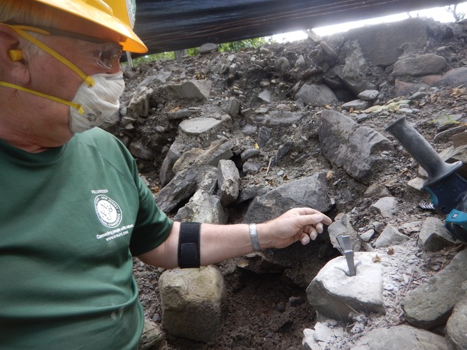 he is trying to get the plug to fit in the form by shaping a few rocks