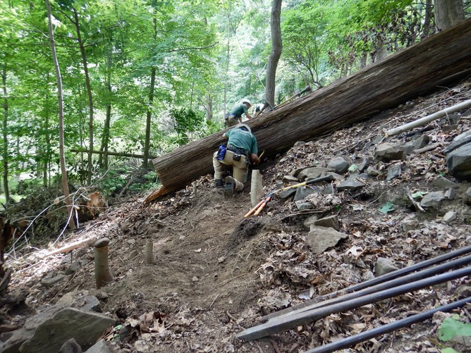 making sure the chainsaw doesn‘t hit any rocks as it cuts through the log