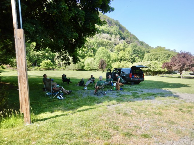 Our Friday crew meeting in the shade