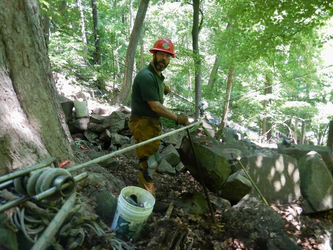 Jeff moving a block or rock into place
