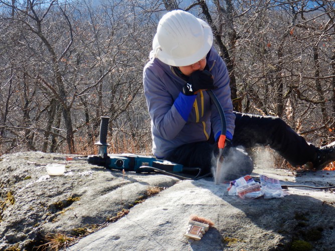 Now Sandy removes the dust from the anchor holes