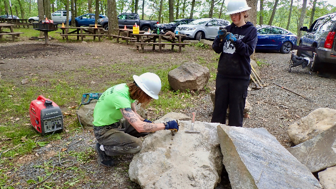 Holes drilled, Beau sets the feathers and wedges